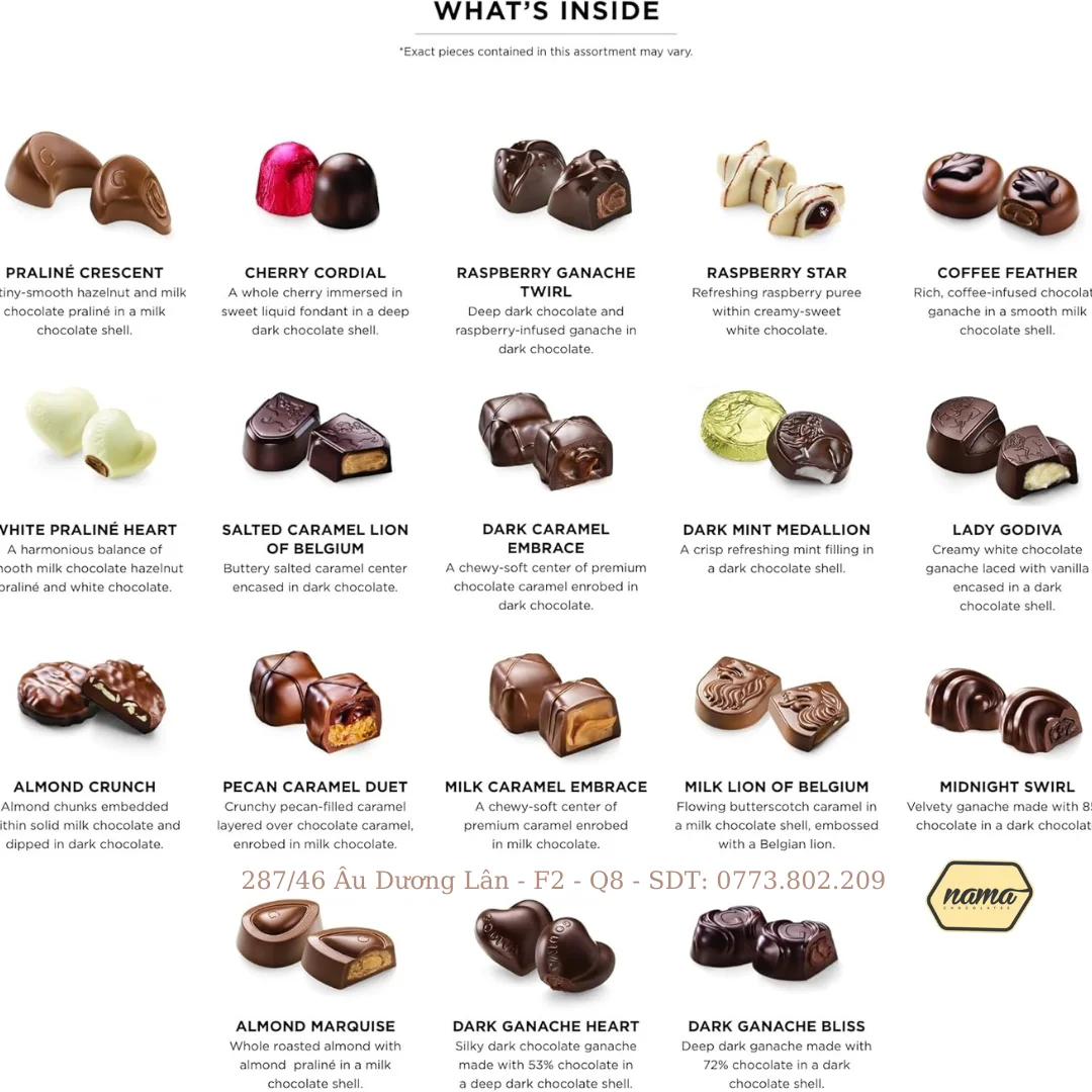 Dưới bàn tay của những nghệ nhân Bỉ, mỗi viên đều được tinh luyện từ bơ cacao nguyên chất, kem tươi, caramel, hạt hạnh nhân và trái cây tự nhiên. Tất cả hòa quyện để tạo nên bản giao hưởng hương vị không thể quên.